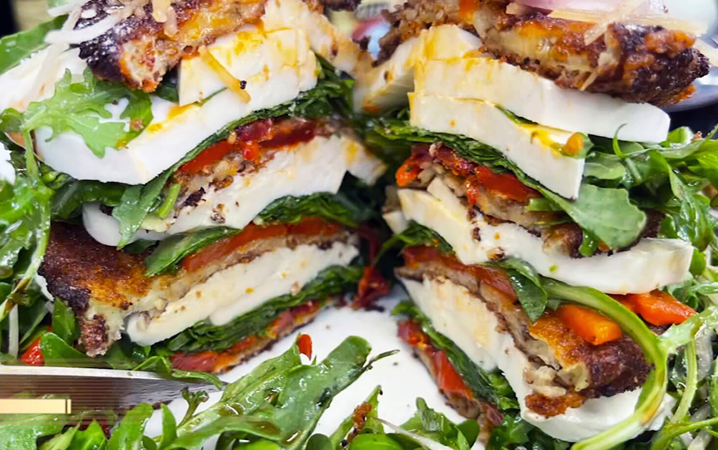 - Place the last slice of eggplant on top and secure with long wood pick.