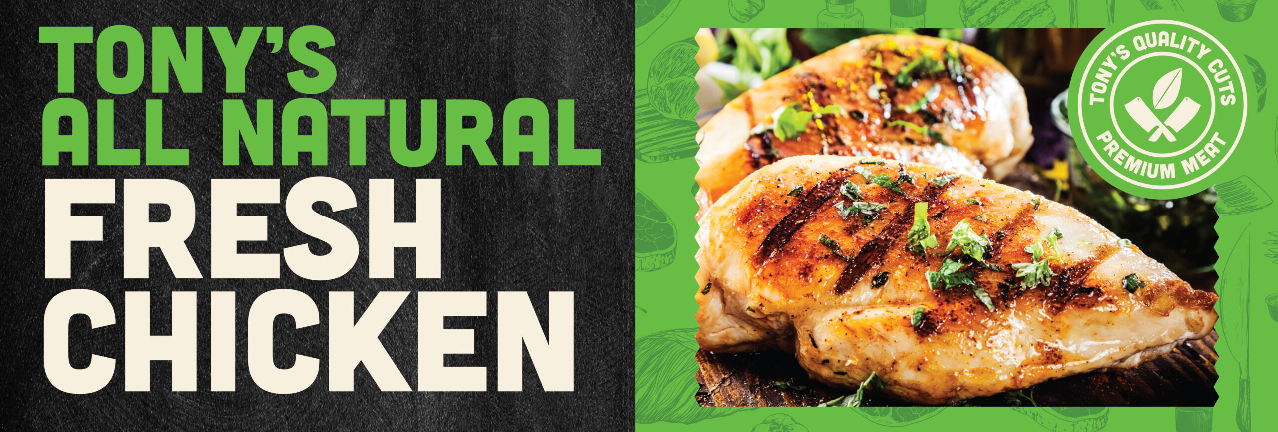 Tony’s All-Natural Fresh Chicken means no antibiotics, EVER! This deliciously juicy chicken is 100% vegetarian fed, no added hormones or steroids, and no additives or preservatives. If you’re looking for the perfect All-Natural Fresh Chicken for your family, look no further that Tony’s Fresh Market’s Meat Department.