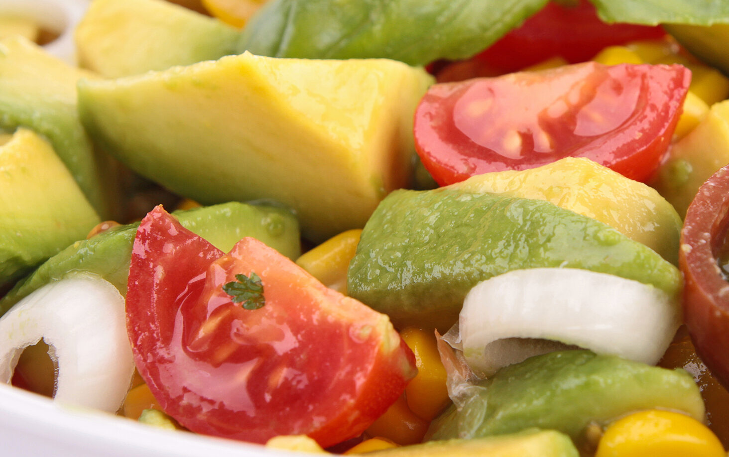 - In a large serving bowl, combine avocados, tomatoes, cucumber, corn, jalapeño, and cilantro.