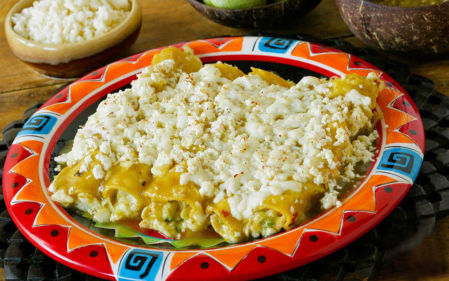 - Cover enchiladas with remaining sauce and bake for 15 - 20 minutes. Top with remaining cheeses and bake for 5-7 minutes or until cheese starts to brown. Remove from oven and drizzle with Cacique® Crema Mexicana. Garnish with cilantro and serve hot.