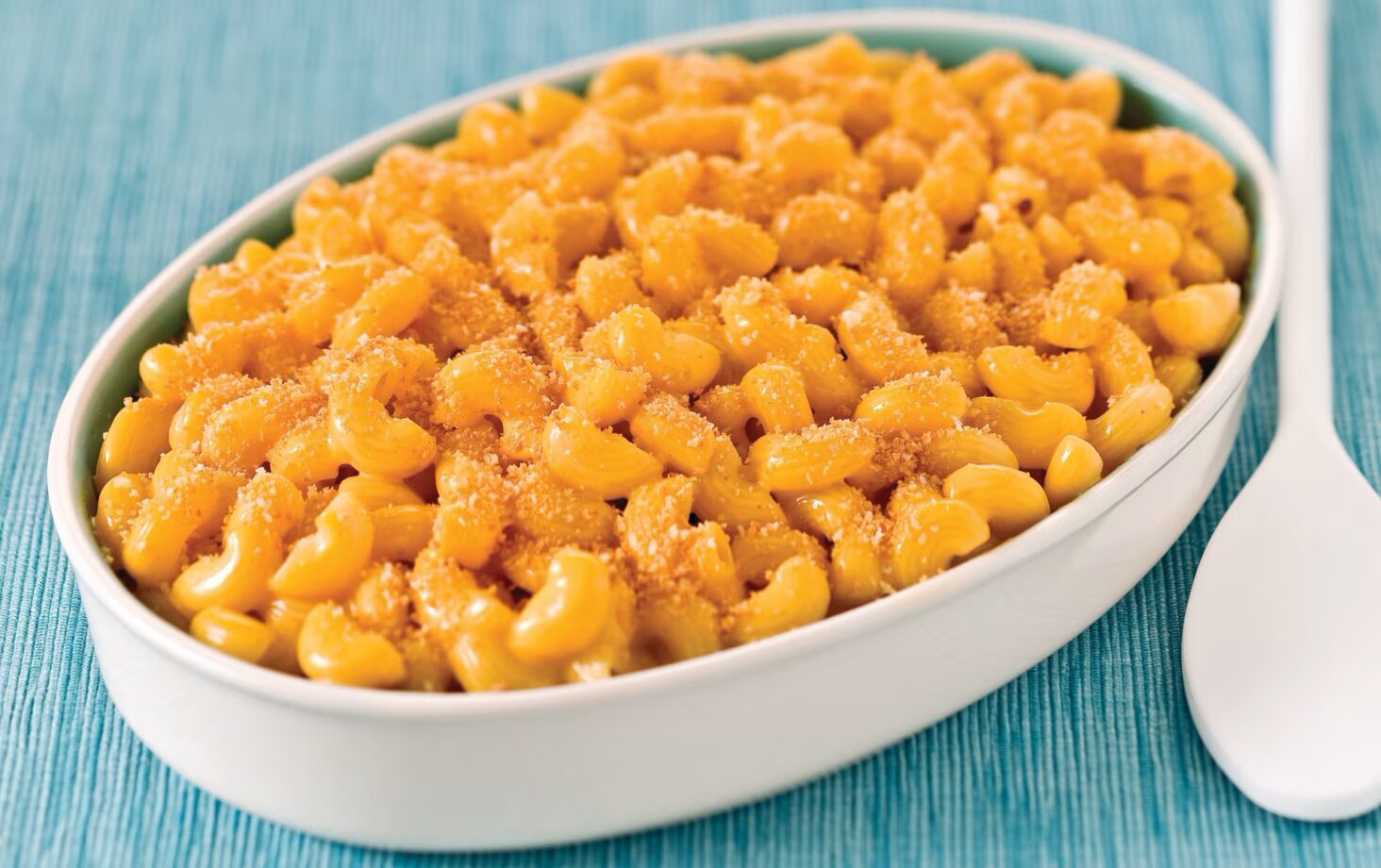 - Spoon macaroni mixture into 1-1/2-qt. casserole sprayed with cooking spray; top with shredded cheese and bread crumbs.