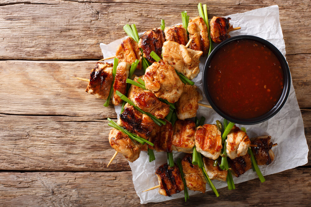- Thread chicken and green onions onto skewers. Add skewers to the grill and cook until golden brown and cooked through, about 3-4 minutes per side.